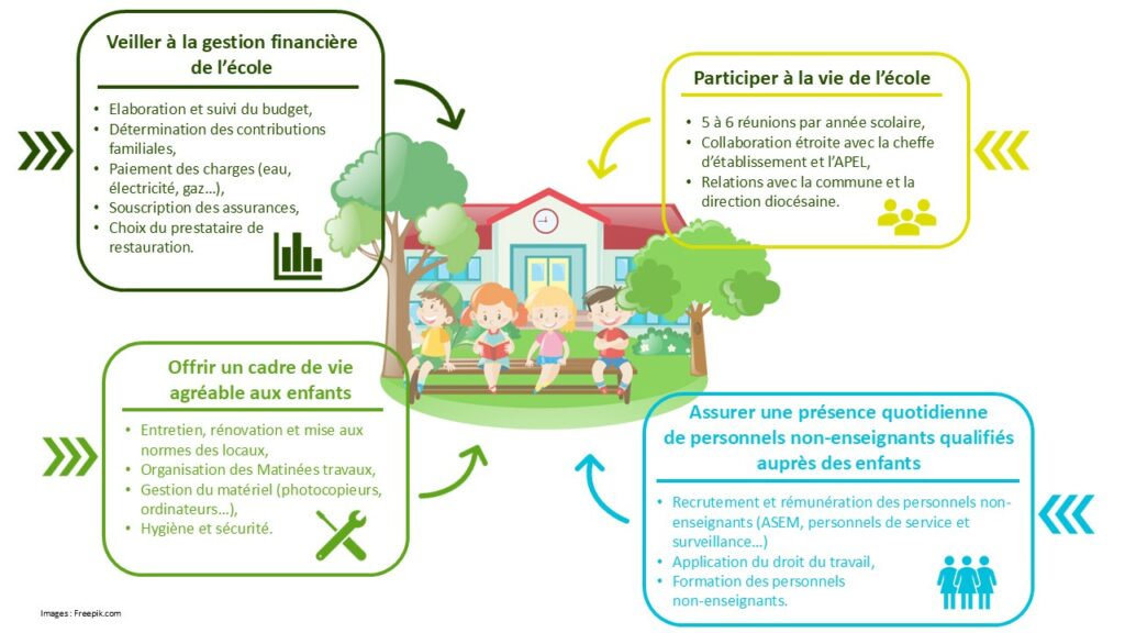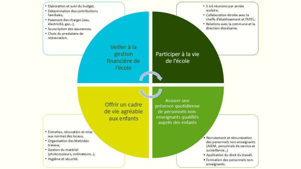 L’OGEC (Organisme de gestion de l’Enseignement catholique) est une association loi 1901 chargée de la gestion financière et immobilière de l’école, en collaboration étroite avec la cheffe d’établissement. Pour l’année scolaire 2025-2026, l’OGEC emploie cinq salariées et une apprentie.